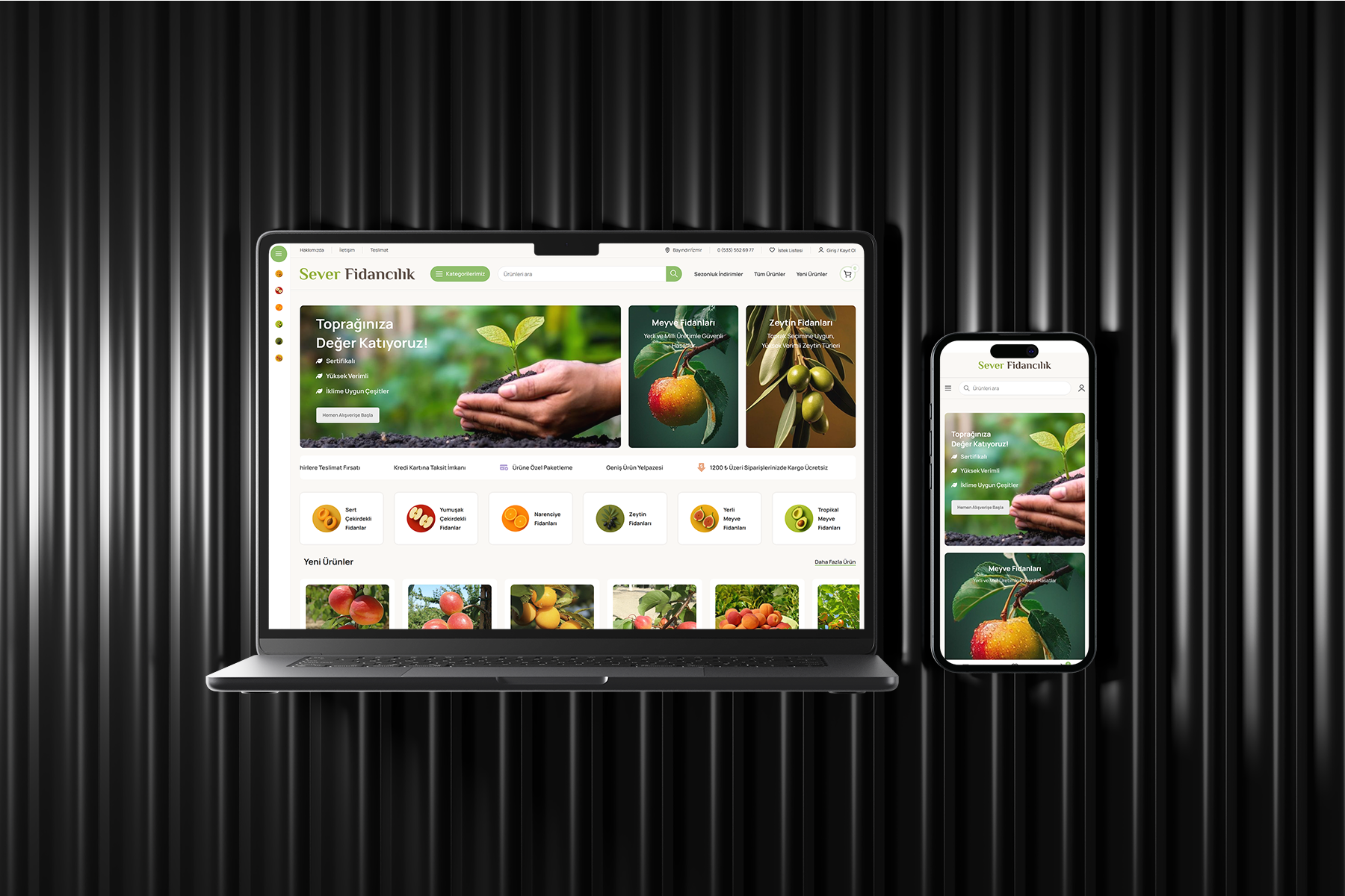 Sever Fidancılık’ın geniş fidan ve bitki ürün gamını dijital ortamda daha erişilebilir kılmak amacıyla modern bir e-ticaret platformu oluşturuldu. Mobil uyumluluk, sade tasarım ve SEO odaklı altyapı sayesinde kullanıcıların ürünlere hızlı ulaşması sağlanarak markaya güven veren bir dijital vitrin kazandırıldı.